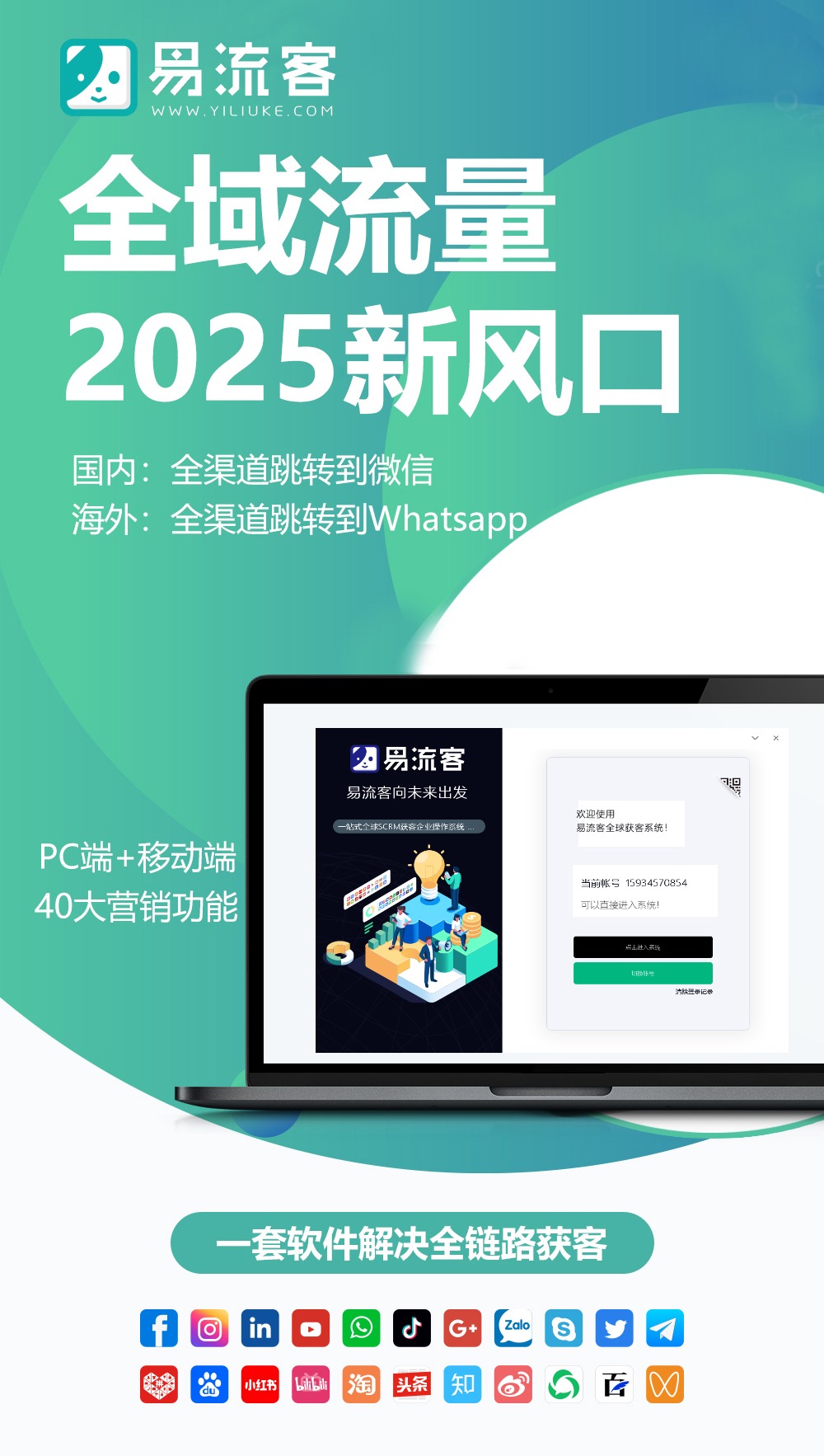 易流客全球獲客系統(tǒng)為企業(yè)在數(shù)字化時代的客戶獲取提供了全面支持和創(chuàng)新。選擇易流客系統(tǒng),選擇更高效、更智能的客戶獲取方式,助力企業(yè)在激烈競爭中脫穎而出,共同開創(chuàng)數(shù)字化時代的客戶獲取新篇章!www.yiliuke.108